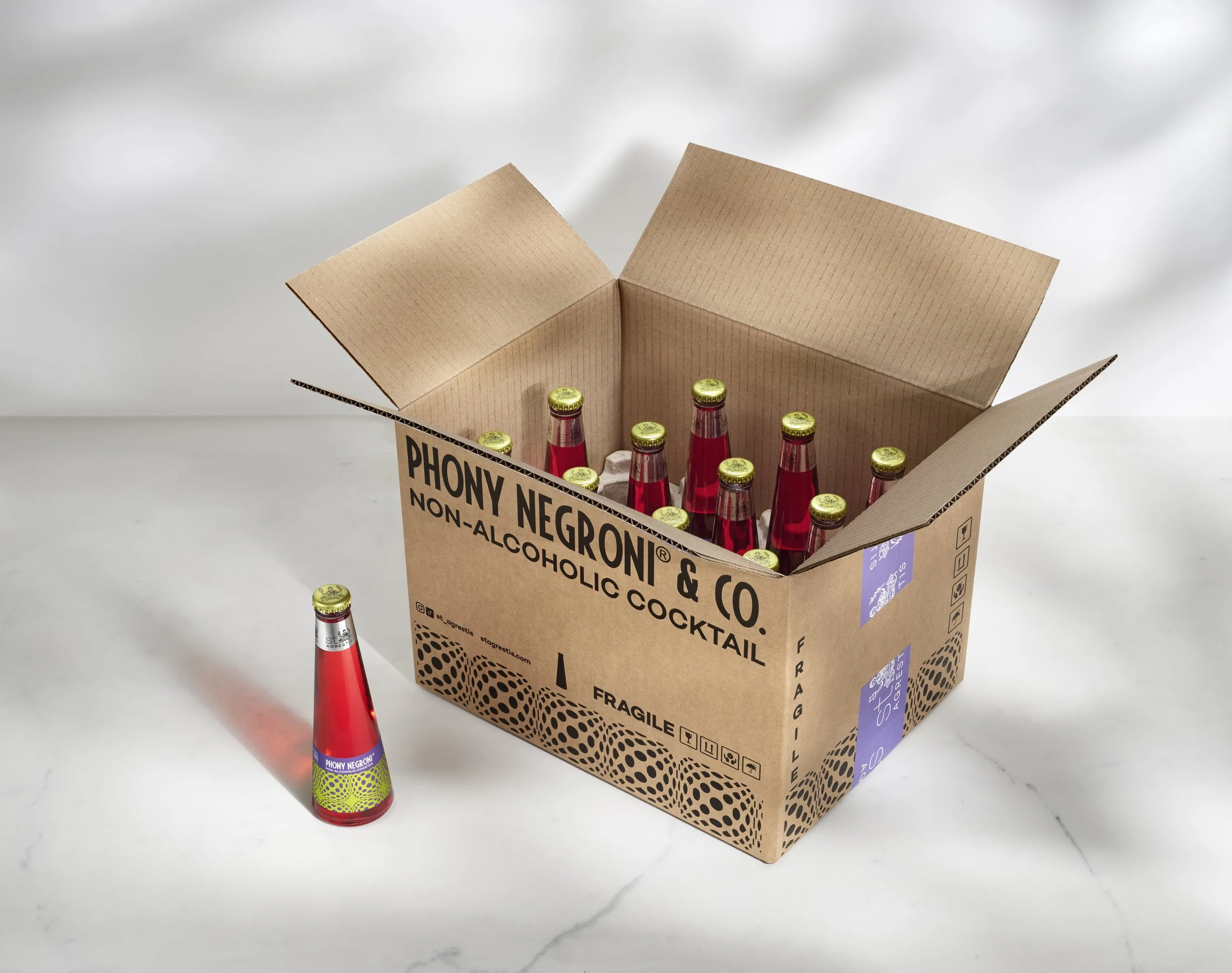 I’ve been working with St. Agrestis since 2020, primarily focusing on packaging design for their now-iconic Phony Negroni. As the non-alcoholic cocktail surged in popularity, it paved the way for an entire line of ‘Phony’ cocktails. My collaboration with the brand actually began just before this mocktail moment, with the creation of the Bag-in-Box Negroni. That project later expanded to include Bag-in-Box designs for the Negroni, Black Manhattan, and Boulevardier. The line received notable recognition, with features in The New York Times, Forbes, Food & Wine, and Bon Appétit.
